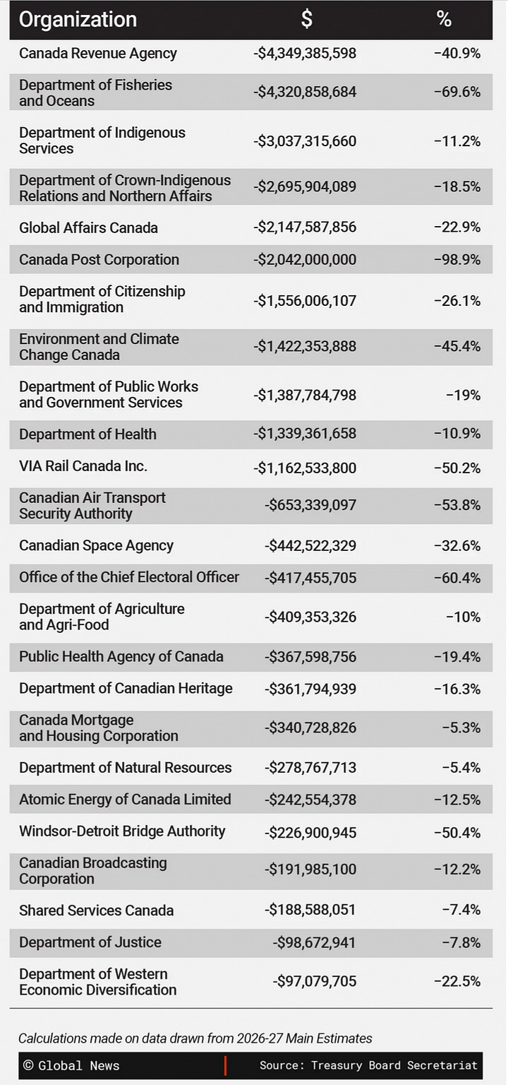 Cut its budget by $159.3 million in 2026-27, $212 million in 2027-28 and $318.5 million in 2028-29 and cut somewhere between 500 and 750 jobs (conflicting reports).